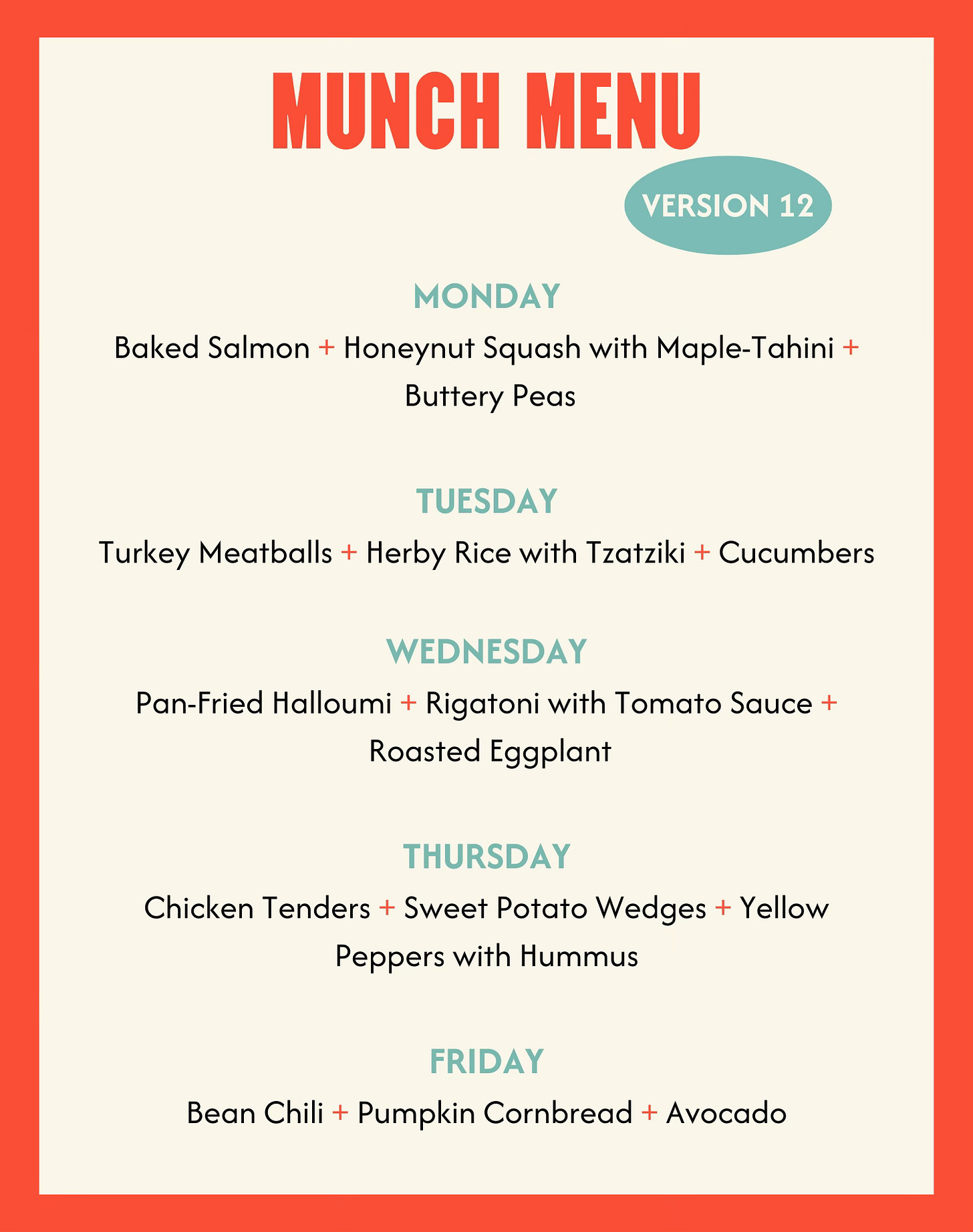 In the meantime, you’ll find honeynut squash featured in this month’s menu. Feel free to substitute butternut, delicata—anything you like. And remember that if your munch doesn’t go for it at first, there are plenty more options to rotate in (in the spirit of the yellow peppers).